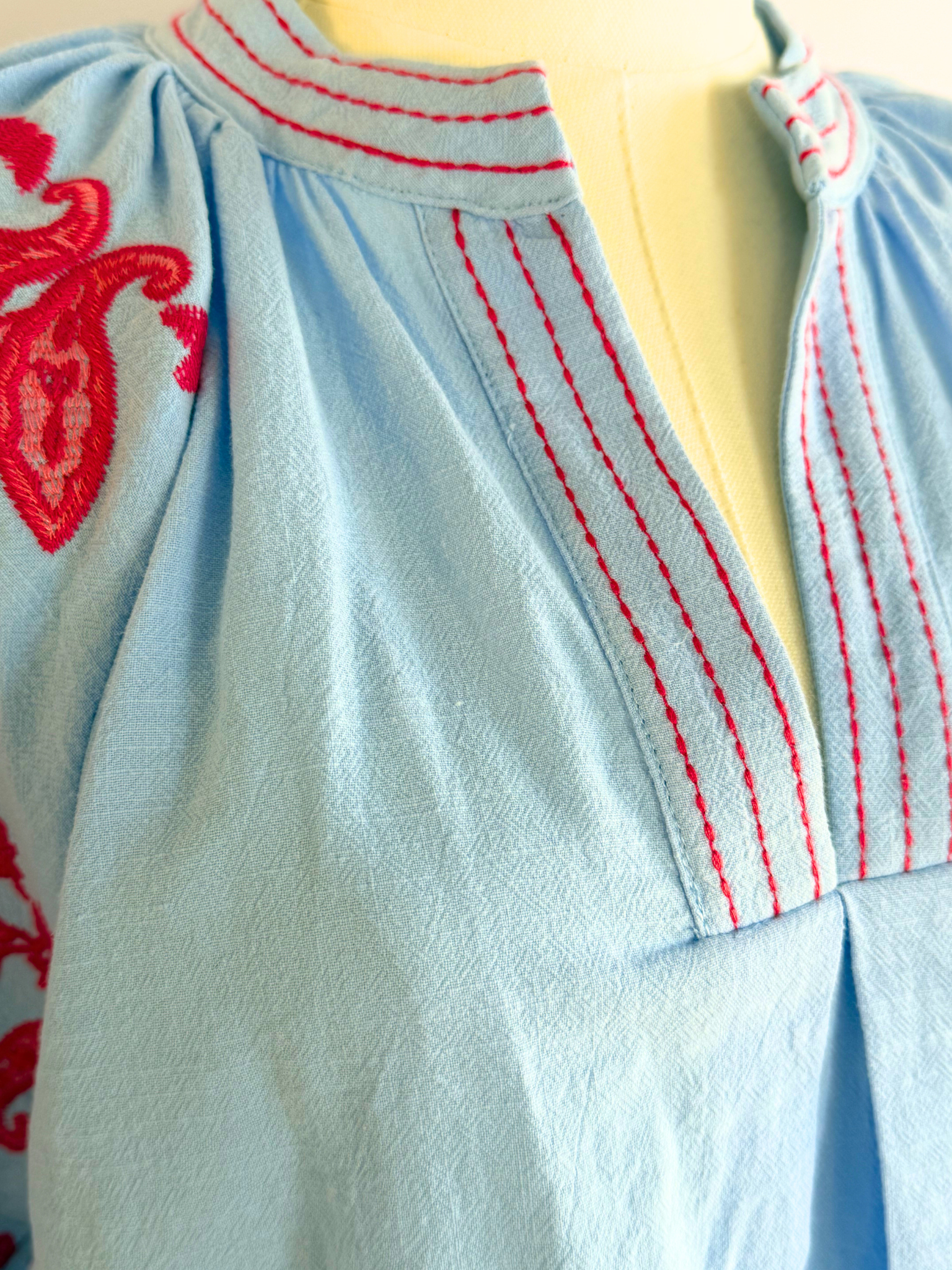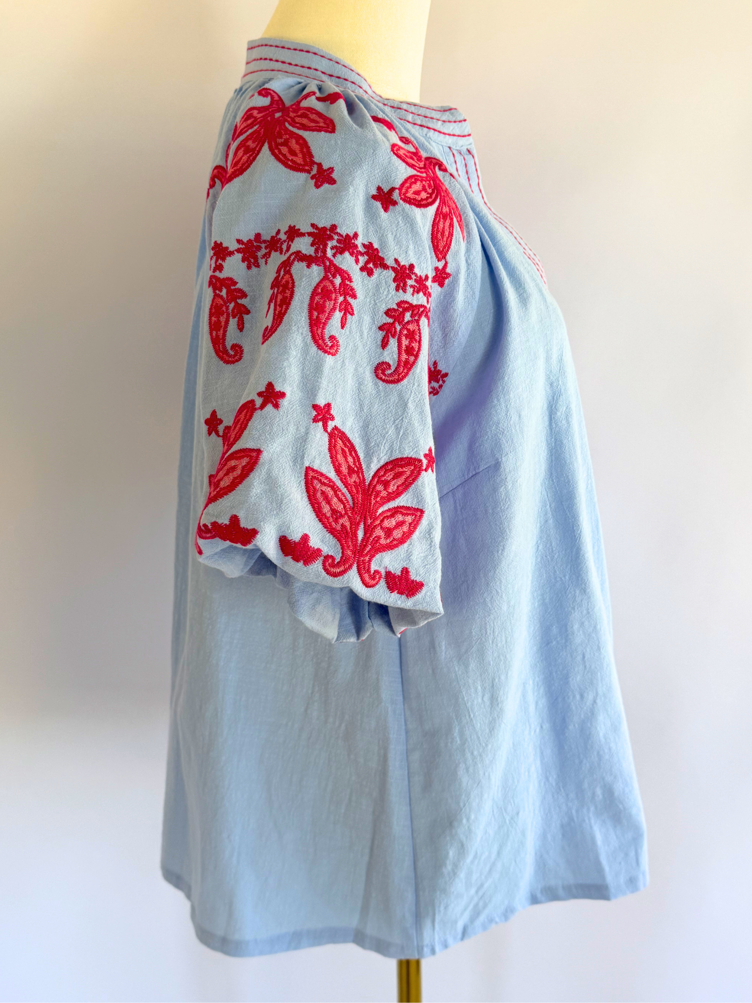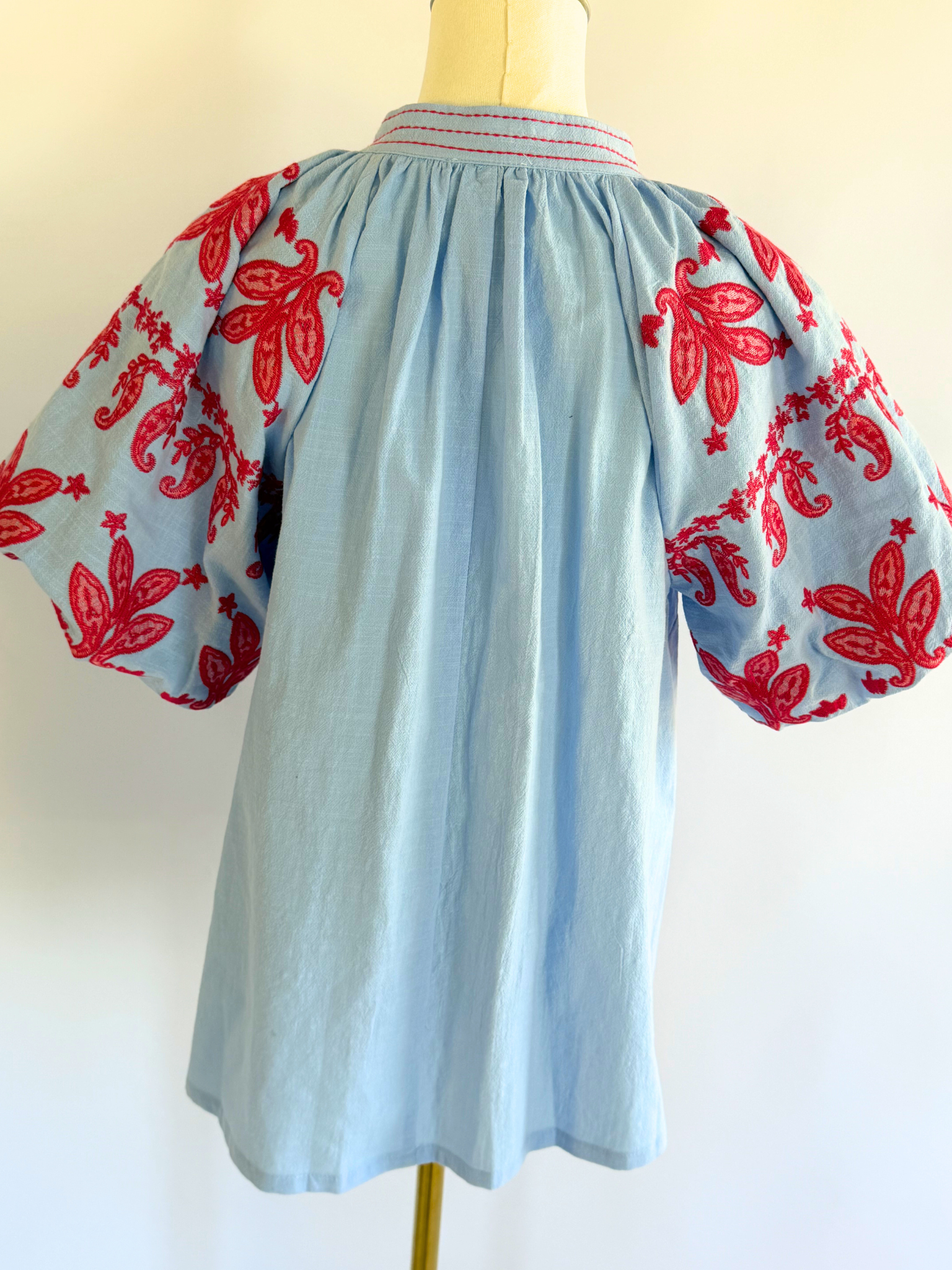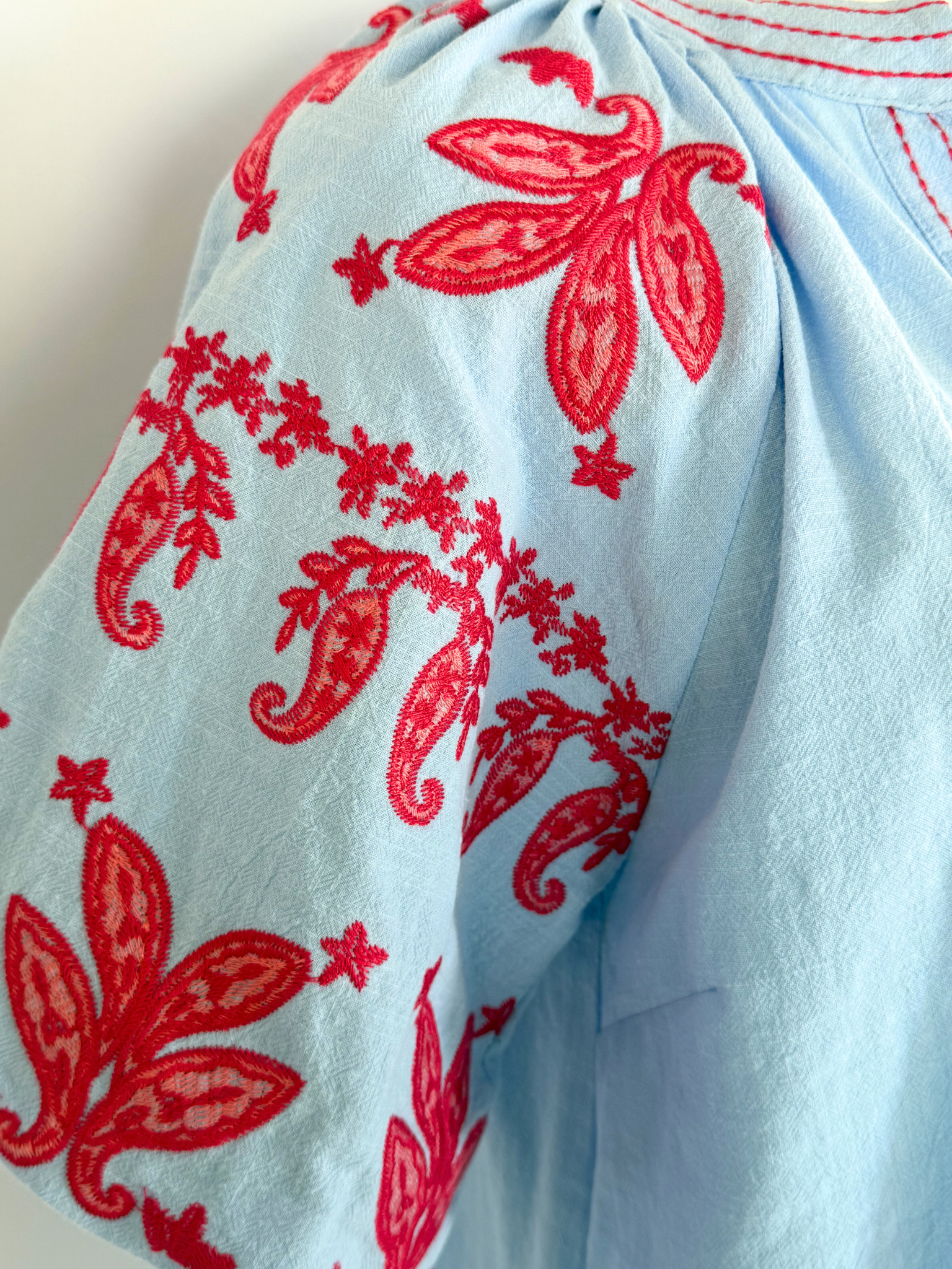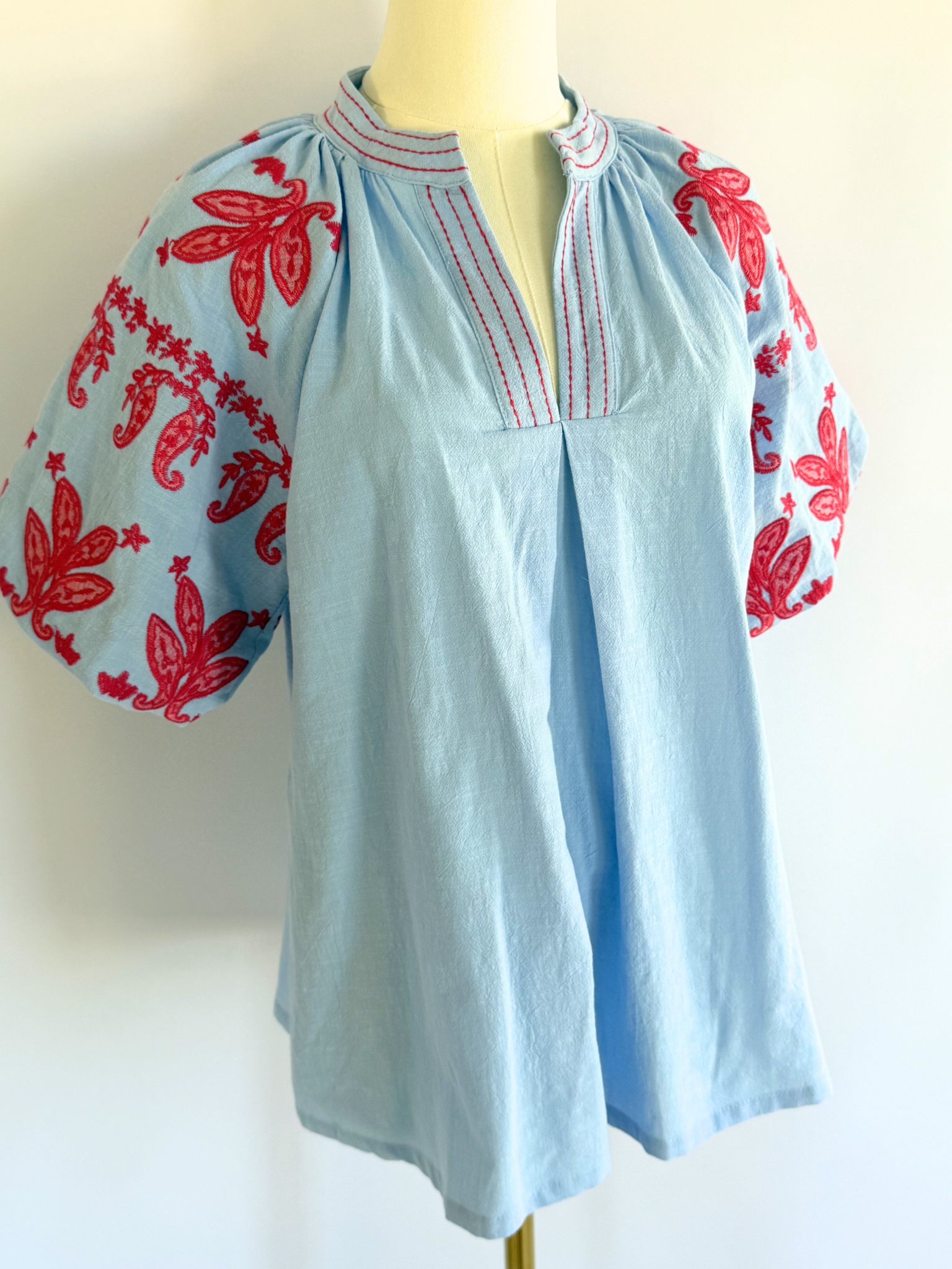 The puff sleeves feature delicate red and pink paisley bandana stitching, a subtle nod to rodeo heritage while matching red stitching traces the collar and runs down the V-neckline like heirloom detail work. A gentle pleat at the front gives it movement and shape and the slight bell at the waist lets it sit just at the top of the waistline for an easy, flattering drape.